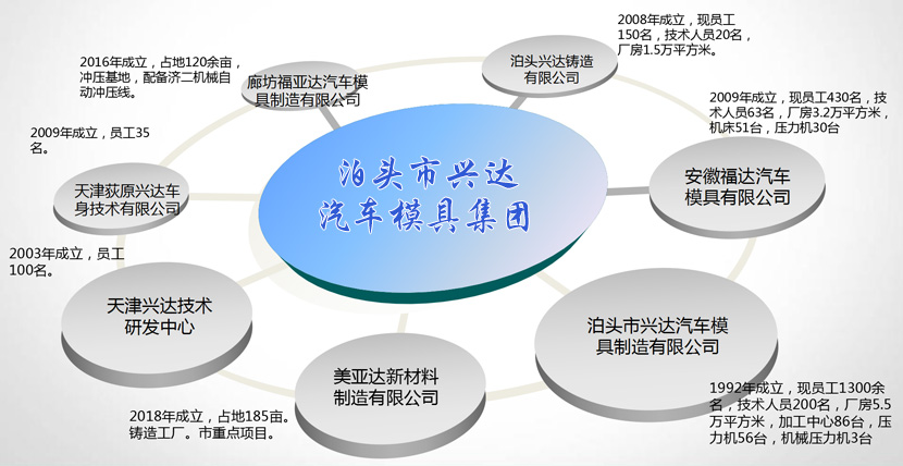 泊頭市興達(dá)汽車模具制造有限公司成立于1992年,是從事汽車覆蓋件產(chǎn)品、模具設(shè)計(jì)制造、沖壓件生產(chǎn)的技術(shù)廠家。下設(shè)7個(gè)分公司、3個(gè)技術(shù)中心,公司占地850畝,建筑面積18萬平方米?,F(xiàn)有職工1680余人,其中技術(shù)人員308人;年產(chǎn)值8.6億元、鑄造年產(chǎn)值1.6億元。